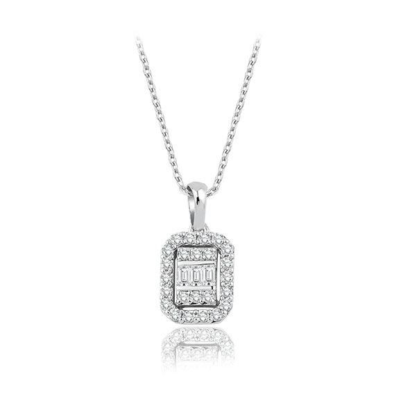 Aşkınızı gösterme için illa yüzük almanız gerekmez. 0.15 karat pırlanta baget kolye ile de aşkınızı dillendirebilirsiniz. Doğum, evlilik, nişan ya da doğum günü için hoş ve şık bir hediye seçeneğidir. F renk, yuvarlak kesim ve SI berraklığında olan bu ürünü set şeklinde de alabilirsiniz. Set yapmak için kolyenin yanına 0.30 karat pırlanta küpe ila 0.20 karat pırlanta baget yüzük ekleyebilirsiniz. Özel kutusuyla gelen ürün 1.40 gram 8 ayar beyaz altından üretilmiştir. Ancak oldukça şık ve gösterişli durmaktadır.