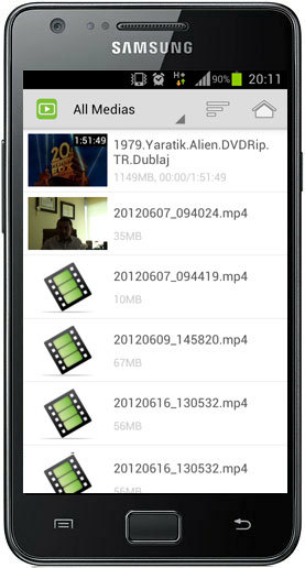 Uygulamanın toplam büyüklüğü 5.4 MB. Yükleme ve kuruluman ardından yazılımı kullanmaya başlıyoruz. DicePlayer ilk olarak telefonumuzdaki videoları tarıyor. Arzu edersek istediğimiz bir klasöre de girerek videoları oynatabiliyoruz.