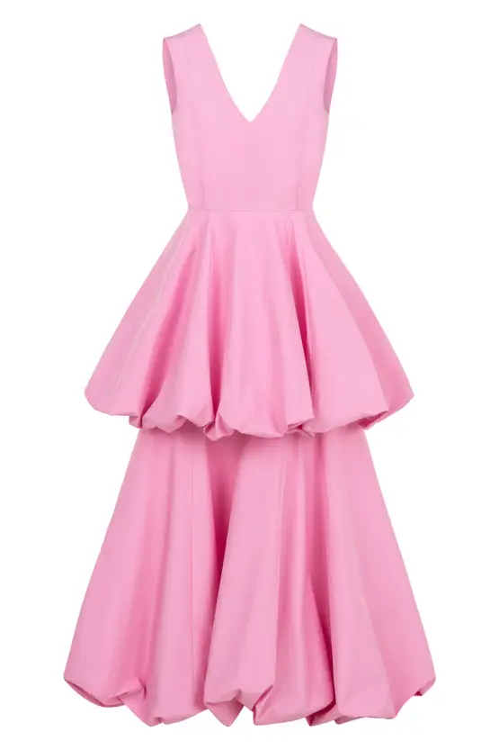 Aurora elbise, zarif tasarımıyla dikkat çeken parça. İncelikle işlenen çift katlı balon etekli yapısıyla kadınsı hava sunarken derin V yakasıyla da modern görünüm kazandırıyor. Pembe rengiyle adeta bir rüyanın parçası gibi duruyor.