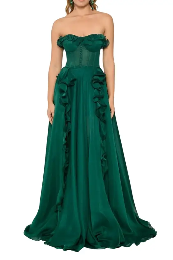 Bel kısmı vücuda oturan kesimiyle kadın figürünü vurgularken etek kısmında yer alan fırfırlı detaylar hareket katıyor. Yırtmaçlı tasarım ise hem cesur hem modern dokunuş kazandırıyor. Yeşil rengi doğanın canlılığıyla tazeliğini yansıtırken aynı zamanda zarafet ile estetiği de temsil ediyor.