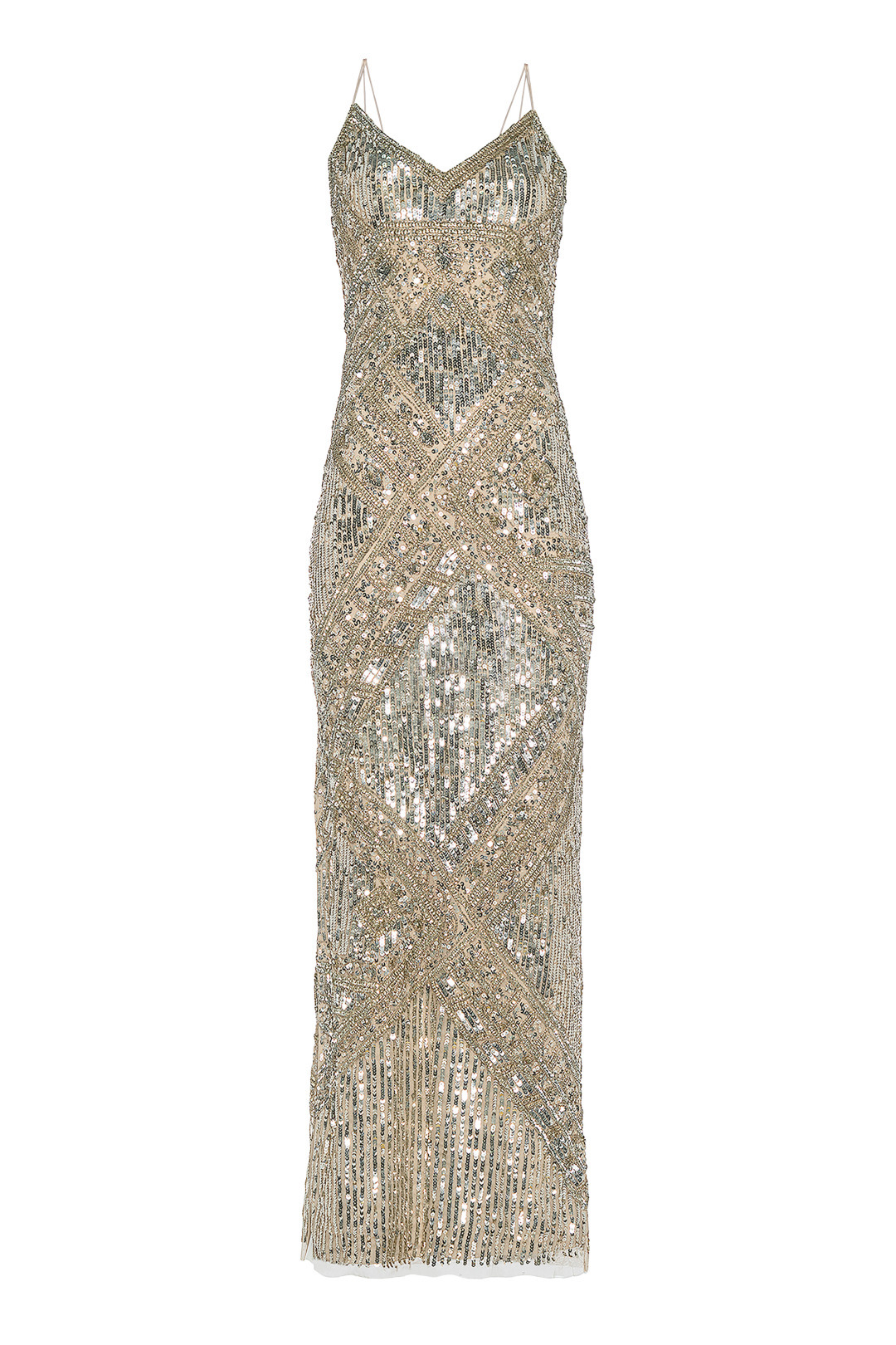 V Yaka İnce Askılı Gece Elbisesi şıklık ve göz alıcılık konusunda katıldığınız ortamın en iddialı isimlerinden biri olmanızı sağlayacak! Gümüş rengin ön planda olduğu bu uzun elbise modeli sayesinde harika tasarımın tadını çıkartabilirsiniz. Modeli dilerseniz daha iddiasız ayakkabı ve çanta alternatifleri ile bir arada kullanabilir ve tasarımı kendi tarzınız ile özdeş bir hale getirebilirsiniz. Aıdan Mattox tasarımlarından hoşlanan kişiler için harika bir alternatif olacaktır.