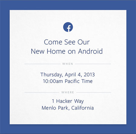 Facebook 4 Nisan’da büyük bir etkinlik düzenleyecek. Bu etkinlik hakkında şu ana kadar bir ipucu verilmiş değil ama aylardır ortalıkta dolanmakta olan Facebook markalı telefonun tanıtılma ihtimali bulunuyor. Gerçi geçirdiğimiz etkinliklerde de aynı iddialar ortaya atılmıştı ama hep sosyal siteleri üzerinde değişiklikler yapmışlardı. Facebook basın mensuplarına gönderdiği davetiyelerde şu sözleri kullandı: “Come See Our New Home on Android” Aslına bakılırsa burada büyük bir ipucu yer alıyor.