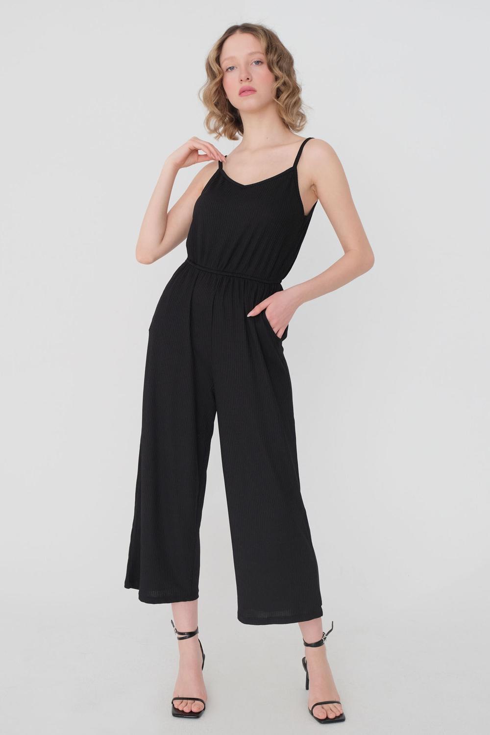 Siyah cep detaylı tulum, farklı beden seçenekleri ile sunuluyor. Yaz aylarının gelmesi ile beraber rahat kumaşı sizi terletmez ve gün içerisinde rahatlıkla kullanabilirsiniz. Cep detayı mevcuttur. Bel bölümünde ince bir kemer bulunuyor. Üzerine alacağınız rahat bir ceketle, akşamları arkadaşlarınızla yapacağınız sportif faaliyetlere katılabilirsiniz. Sonbahar sezonunda hırka ile kombinlenebilir. Her açıdan kullanışlıdır!