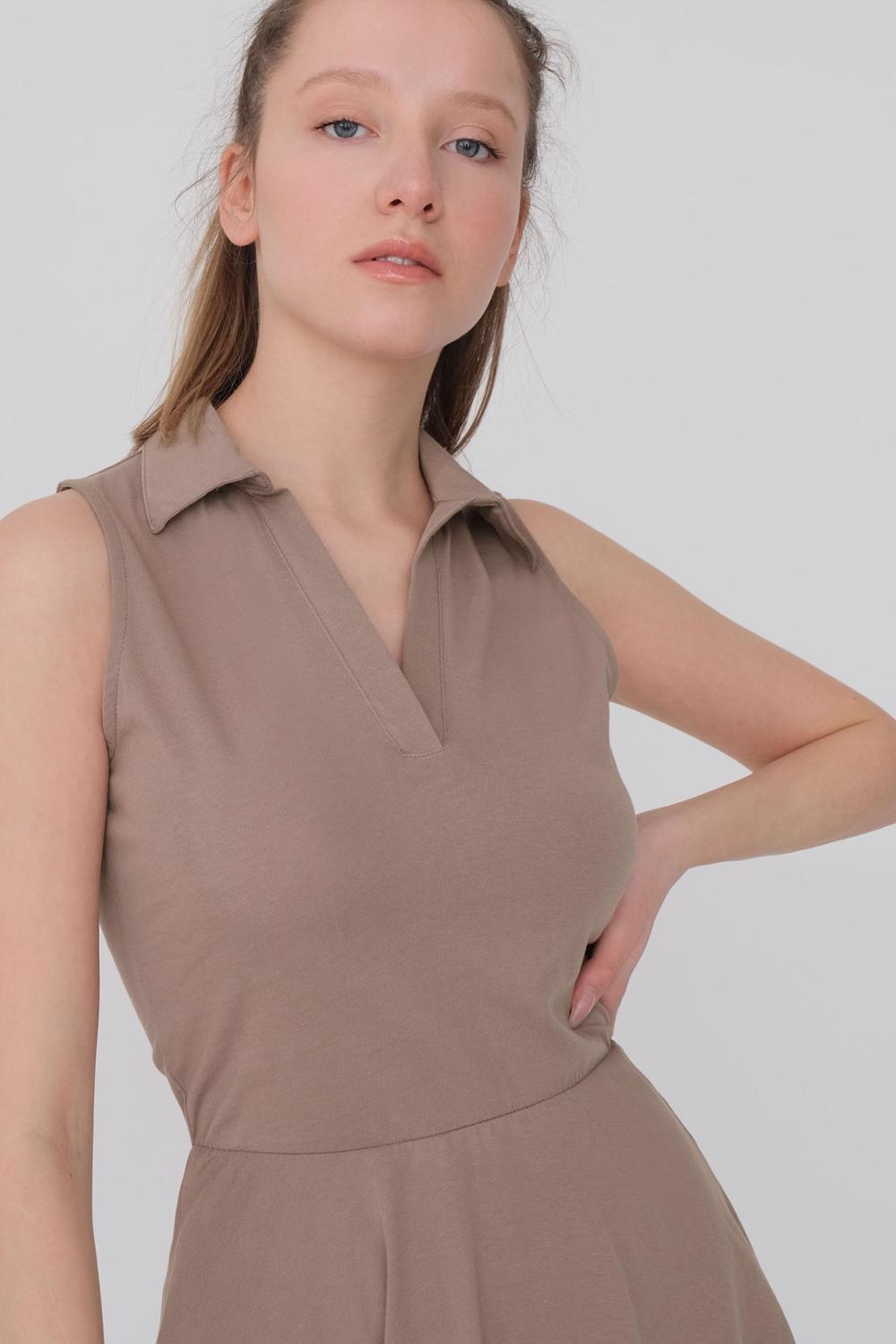 Açık kahve V yaka elbise, sade ve düz tasarımı ile sunuluyor. Oldukça rahat bir üründür. Geniş yaka detayı mevcut. Bel bölümünden aşağısında, pileli bir tasarım kullanılmış. Kumaş yapısı kaliteli olduğu için ürünü yıkama ya da ütüleme gibi işlemlerde zarar görmeden kullanabilirsiniz.