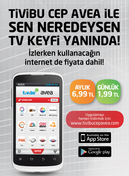 Tivibu, TTNET’in en özel servisleri arasında yer alıyor ve bilgisayar ile mobil cihazlarınız üzerinden anlık olarak televizyon, film ve dizi izleme imkanı sunuyor. Üstün televizyon özellikleriyle, hatta izleyicinin işine yarayacak özellikleri televizyondan daha çok içinde barındırarak mükemmel bir izleme deneyimi sunan Tivibu son olarak Avea ile bir işbirliği içine girdi. Tivibu Cep Avea kampanyasıyla birlikte aylık 6.99 TL’lik bir ödeme yaparak bir ay boyunca istediği film ve diziyi telefonları ve tabletlerinden izleyebilecek, en çok izlenen 60 tane televizyon kanalını da yine mobil cihazları üzerinden takip edebileceksiniz.