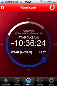 Vodafone, tüm Türk Müslümanlar için özel bir program geliştirdi. Bu program sayesinde iftar, namaz ve sahur saatinizi telefonunuzdan öğrenebilecek, isterseniz yine programı belirli saatlere alarm olarak kurabileceksiniz. Ayrıca bulunduğunuz şehri ayarlama sorunu bu güzel uygulamada yok. Bu sorunu bilen Vodafone otomatik şehir ayarlama özelliği sayesinde bize bilgileri otomatik olarak gösteriyor.